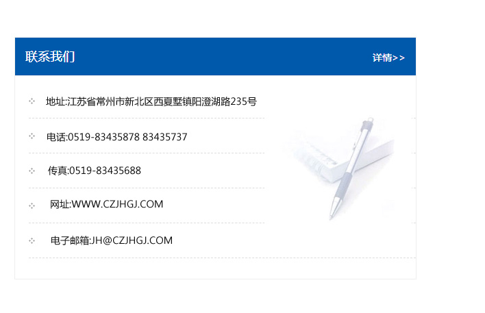 地址:常州市新北區友邦商務大廈1幢16、17層  電話:0519-85101652  傳真:0519-85112595  郵編:213022  網址:www.cz-jiayue_cn.12jianfei.com  郵箱:xiajifengaa@163.com